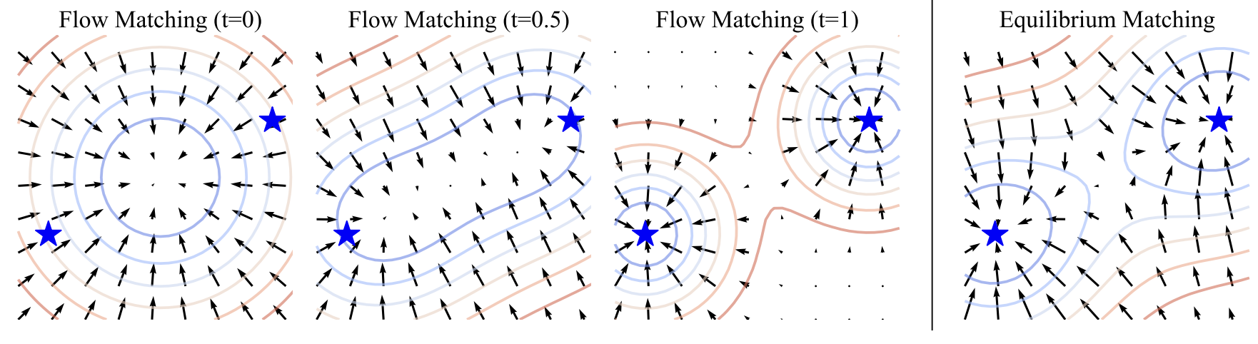 We introduce Equilibrium Matching (EqM), a generative modeling framework built from an equilibrium dynamics perspective. EqM discards the non-equilibrium, time-conditional dynamics in traditional diffusion and flow-based generative models and instead learns the equilibrium gradient of an implicit energy landscape. Through this approach, we can adopt an optimization-based sampling process at inference time, where samples are obtained by gradient descent on the learned landscape with adjustable step sizes, adaptive optimizers, and adaptive compute. EqM surpasses the generation performance of diffusion/flow models empirically, achieving an FID of 1.90 on ImageNet 256×256. EqM is also theoretically justified to learn and sample from the data manifold. Beyond generation, EqM is a flexible framework that naturally handles tasks including partially noised image denoising, OOD detection, and image composition. By replacing time-conditional velocities with a unified equilibrium landscape, EqM offers a tighter bridge between flow and energy-based models and a simple route to optimization-driven inference.